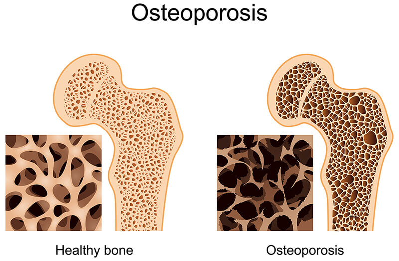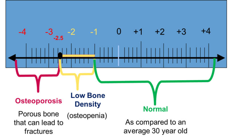 Osteoporosis (meaning porous bones) is diagnosed by assessing bone mineral density (BMD) of the hips and spine using a specialised Xray known as a Dual Energy Xray Absorptiometry (DEXA) scan. Scan results are expressed as T-scores which compare a person’s BMD with the average of young healthy adults. Osteopenia (low bone density) is defined as a BMD T-score between -1 to -2.5, and osteoporosis is defined as a BMD T-score of ≤ -2.5.
