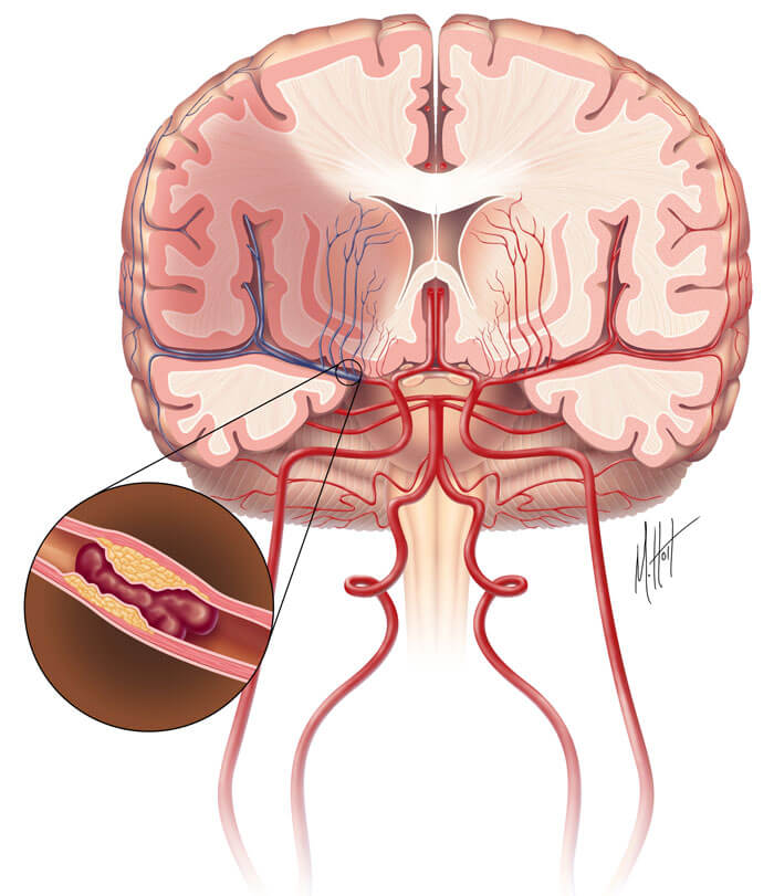 Ischaemic strokes occur when an artery supplying the brain is blocked. They account for nearly 90% of all strokes. Thrombotic ischaemic strokes occur when a clot develops in an artery of the brain at the site of the blockage. Embolic ischaemic strokes occur when a clot travels throughout the body and lodges itself in an artery of the brain that is too narrow to pass through.
